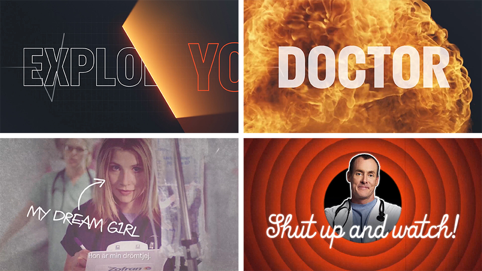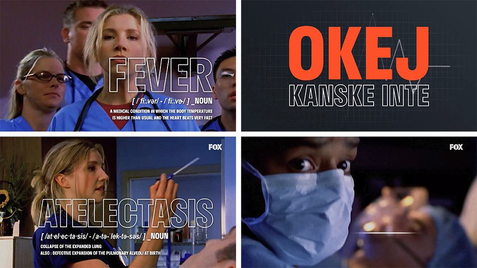 Production of a "launch" commercial and a "generic" commercial to promote the TV series Scrubs on FOX Channel Sweden. The launch commercial, due to the unavailability of the series' footage, relies on still images and motion graphics, while the generic commercial used edited clips composed in a musical theme.