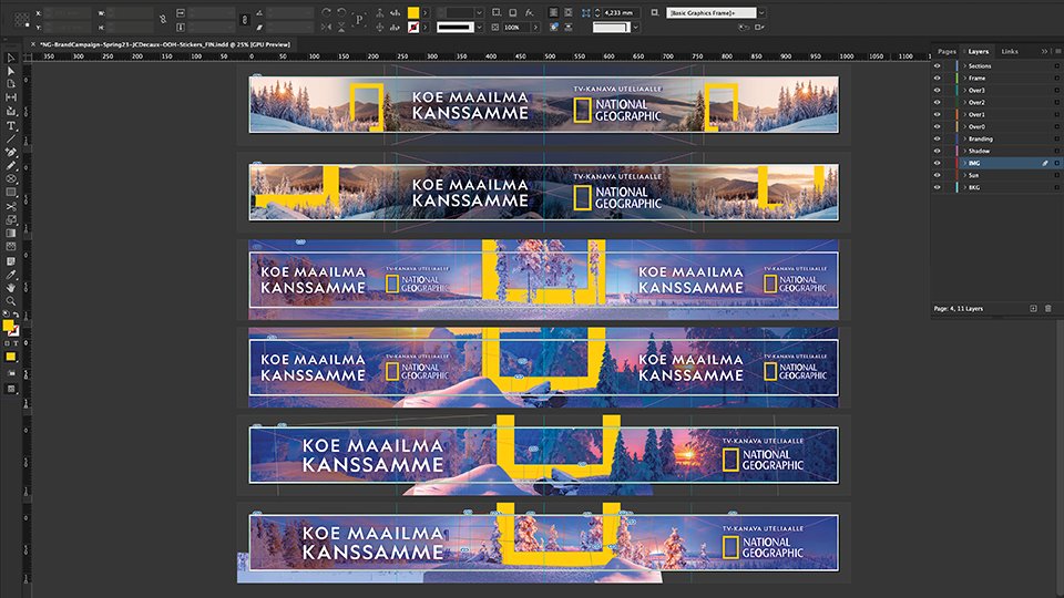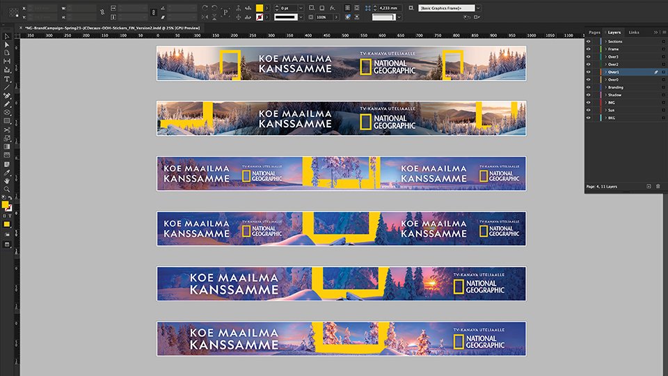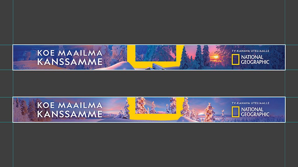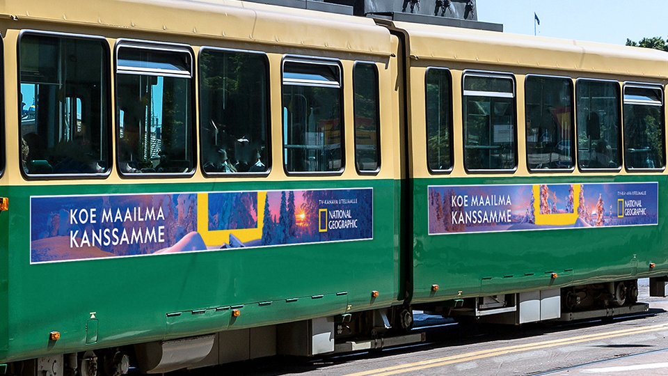 Advertisement production for tram-side placements promoting National Geographic Channel in Finland requiring original compositions following the theme of winter Finnish nature. The project began with different proposals, followed by compositing and production for the printed advertisements.