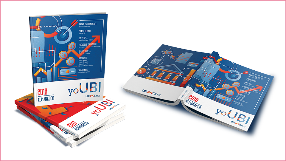Visual identity restyle of the yoUBI almanac, an annual publication by UBI Bank showcasing various activities and achievements from the past year. The process involved visual identity restyling, illustration production, layout design, and curation of the publishing and printing process.